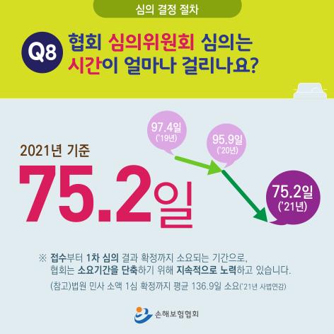 심의위원회는 교통법규와 통행우선권 등을 바탕으로 미리 정해진 ‘기본과실’에 음주와 과속 등 사고 요인을 추가로 가감해 과실비율을 확정한다. 손보협회는 접수된 분쟁건에서 70.7%는 기본과실 비율의 ±10%포인트 범위 안에서 과실비율이 결정되었다고 설명했다.2021년 과실비율 심의에는 2019년의 97.4일보다 대폭 단축된 평균 75.2일이 걸렸다.