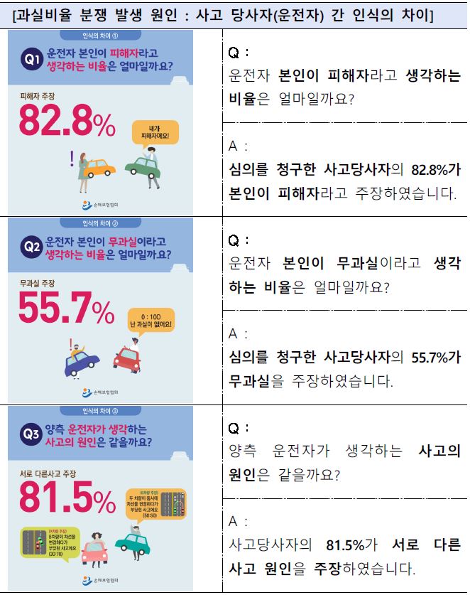 2021년 자동차 사고 약 370만건 중 약 3%에서 당사자 간 과실비율 분쟁이 발생, 과실 비율 심의로 이어졌다. 이전보다 운전자들이 접한 정보다 다양하다보니 분쟁이 는 것으로 파악하고 있다. 작년 4월부터 8월까지 심의된 분쟁 1만8618건을 손해보험협회·서울대가 분석한 결과를 보면 청구인의 82.8%는 본인을 ‘피해자’로 판단했다. 55.7%는 ‘무과실’이라고 주장했다. 과실비율 심의 신청자의 과반은 사고 책임이 전혀 없다고 느끼고 있고, 절대다수는 피해자로 여긴 것이다.