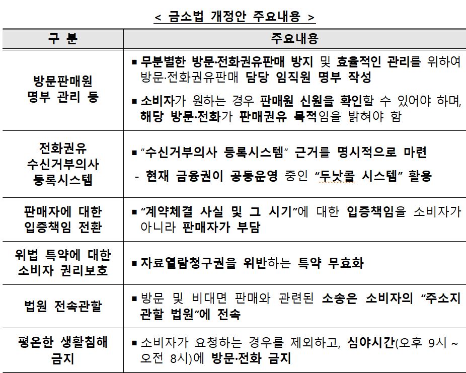 또한 투자성 상품이 손실 가능성을 갖고 있고 금융회사·소비자 간 정보비대칭·불완전판매 소지가 크다는 점을 감안해 무분별한 방문판매가 이뤄지지 않도록 규율을 강화하기로 했다. 금소법 상 투자성 상품에 대한 ‘불초청권유 금지’의 예외 범위를 재검토해 과도한 방문판매로 인한 금융소비자 피해를 사전에 방지할 방침이다.